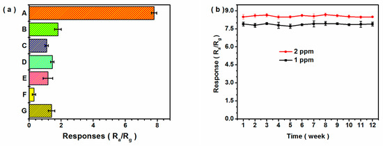 (a) Sensing responses of 1.25Fe−h/m−WO3 sensor to 1 ppm acetone and 1 ppm other gases under LED illumination at 90% RH atmosphere (A: acetone, B: ethanol, C: methanol, D: toluene, E: NH3, F: NO, G: CO). (b) Long−term stability of 1.25Fe−h/m−WO3 sensor to 1 and 2 ppm acetone over a duration of 3 months under illumination at 90% RH atmosphere.