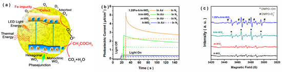 In the general sensing mechanism for acetone analysis, free electrons of the WO3 sensor at the working temperature were trapped by adsorbed oxygen molecules on the surface, forming reactive oxygen species. Upon exposure to acetone gas, chemisorbed oxygen components reacted with acetone molecules, and the electrons were released back to WO3. In this study, Fe-doping resulted in the generation of holes via defect reactions for the 1.25Fe−h/m−WO3 sensor, promoting the adsorption ability of oxygen molecules [24,25]. In addition, more electrons were generated under LED light illumination (Figure 7a), and inhibited recombination of photo-induced electrons and holes was achieved by the phase junction and Fe doping, which facilitated the formation of reactive oxygen species. Based on the above mechanism, rapid combination of electrons and adsorbed oxygen molecules played a key role for the enhanced acetone sensing performance. Photocurrent decay measurements were further conducted to explore the electron transfer. Under N2 atmosphere, photocurrents of all the samples were stabilized during the entire period of irradiation (Figure 7b). However, the photocurrent gradually decayed under air atmosphere. The photocurrents of h/m−WO3 phase junction samples were higher than those of h−WO3 and m−WO3 samples, which implied that the separation of photo-induced electrons and holes was promoted by the phase junction. Notably, the photocurrent of 1.25Fe−h/m−WO3 decayed faster than those of the undoped WO3-based samples. It was noteworthy that the decay of photocurrent was mainly due to the competitive electron trapping between O2 and FTO substrate [36]. Additionally, superoxide radicals were important for gas-sensing properties of semiconductors [18], and electron spin resonance (ESR) measurements were further conducted to demonstrate the formation of superoxide radicals. 5,5−Dimethyl−1−pyrroline N−oxide (DMPO) was adopted as a trapping agent for free radicals. As shown in Figure 7c, three peaks were observed for the h−WO3 and m−WO3 samples, which were caused by DMPO oxidization. The 1:2:2:1 quartet peaks, representing the characteristic signals of DMPO−·OH [37,38], were discovered for the h/m−WO3 sample. It was notable that the 1:1:1:1:1:1 six−fold peaks of DMPO−O2−· were found for the 1.25Fe−h/m−WO3 sample, which indicated that abundant superoxide radicals were formed due to the interaction of dissolved oxygen and photo-induced electrons [37]. Photocatalytic degradation performances of WO3−based samples were further measured to prove the formation of superoxide radicals, and the results were shown in supplementary material S2. Based on the photocatalytic performance (Figure S7–S11), Fe impurity facilitated the photoinduced electron transfer from WO3 to the adsorbed oxygen, leading to the generation of superoxide radicals [37,39]. Hence, the formation of WO3 phase junctions was favorable for carrier separation, and Fe doping benefited the oxygen adsorption on the WO3 surface, leading to increasing electron transfer and promoting the generation of superoxide radicals.