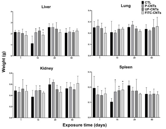 Organ weights (g) from mice exposed to different CNTs at different exposure times. Each graph shows the data of the indicated organ, the bars represent the mean ± SD obtained for each group (n = 4). CTL, vehicle control (0.2% Pluronic F127 in sterile phosphate buffer). * indicates significant differences vs the control group (α= 0.05). Data were analyzed by Dunnett’s test.