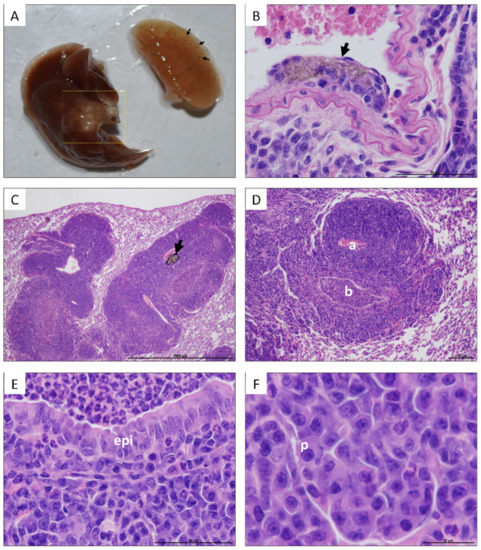 In the case of the lungs, no significant changes in weight were detected based on the exposure time or the type of CNTs used (Figure 2). Notwithstanding, lungs of some mice exposed to UP-CNTs at 60 days post-inoculation had a visible decrease in size and were mainly affected in the right lung (Figure 3A) and which was probably caused by vascular obstruction due to nanoparticles (Figure 3B). Additionally, left lung presented a malignant lymphoproliferative process localized mainly at peribronchial and perivascular localization (Figure 3C, D). A notable infiltrate with neutrophils and abnormal large lymphocytes (plasmacytoid cells) was detected surrounding the bronchioles (Figure 3E,F).