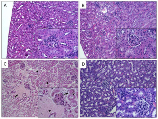 Histopathological findings in kidney of mice exposed to different types of CNTs. Microphotographs show kidney sections of mice exposed to: A, control group non exposed, the normal morphology of renal cortex (g, glomerulus); B, P-CNTs exposed group. C, UP-CNTs exposed group, hemorrhagic areas (arrows) and small spherical bodies trapped in glomeruli and damaged areas (arrowheads) that corresponds to UP-CNTs. D, FITC-CNTs exposed group. Microphotographs are representative of one experiment. Magnifications 10×. Insets show magnification at 40×. H&E staining.
