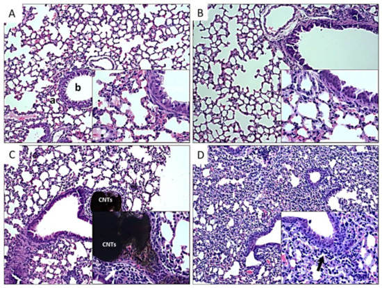 Histopathological findings in lungs of mice exposed to different types of CNTs. Microphotographs show lung sections of mice exposed to: A, control group non exposed, the normal morphology of bronchiole (b) and alveoli (a) is shown; B, P-CNTs exposed group. C, UP-CNTs exposed group, accumulation of CNTs in the artery, and inflammatory infiltrate in alveolar walls (arrow). D, FITC-CNTs exposed group, inflammatory infiltrate (arrow), of note is the decrease of the alveolar sacs in the lung. Microphotographs are representative of one experiment. Magnification 10X. Insets show magnification at 40×. H&E staining.