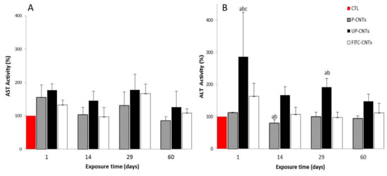 Effect of exposure with different CNTs on the relative activity of AST and ALT. Relative activity of serum aminotransferases in mice exposed to different CNTs at 1, 14, 29, and 60 days post exposure. (A) AST and (B) ALT activities. Each bar represents the mean ± SE of each group (n = 4). a: difference with respect to the control (p < 0.05). b: difference among treatments (p < 0.05), and c: difference among times post exposure (p < 0.05).
