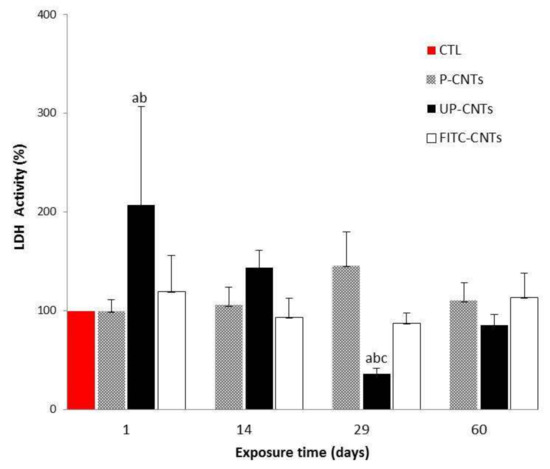 Effect of exposure with different CNTs on the relative activity of LDH. Relative activities of serum LDH in mice exposed to different CNTs at 1, 14, 29, and 60 days post exposure. Each bar represents the mean ± SE of each group (n = 4). a: difference with respect to the control without stimulus (p < 0.05). b: difference between treatments (p < 0.05), and c: difference between times post exposure (p < 0.05).