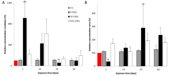 Effect of exposure to different CNTs on levels of urea and creatinine. Graphics show relative concentration of A, urea and B, creatinine, at 1, 14, 29, and 60 days post exposure. Each bar represents the mean ± SE of each group (n = 4). a: difference with respect to the control without stimulus (p < 0.05). b: difference among treatments (p < 0.05), and c: difference among times post exposure (p < 0.05).