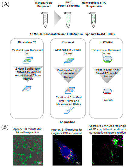 Imaging workflow applied to investigate the effect of the surface coating composition on the uptake, trafficking, and corona kinetics of titanium oxide (TiO2) nanomaterials (NMs). (A) Serum containing media is labeled with fluorescein isothiocyanate (FITC) prior to incubation with TiO2 NMs. (B) Adenocarcinomic human alveolar basal epithelial (A549) cells are then exposed to TiO2 NMs in FITC-serum for 15 min before subsequent washes and post incubation in either unlabeled serum (Biostation CT and confocal experiments) or Alexa-647-labeled serum (dSTORM). Images were acquired over relevant time points and analyzed for a quantitative comparison of the effects of different coating surface chemistries.