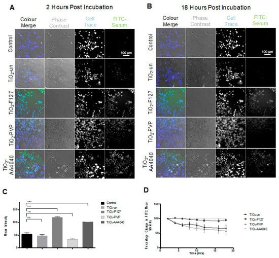 As shown in Figure 2A,B, there is a notable difference in the surface fluorescence intensity when comparing uncoated and surface-modified TiO2 NMs at 2 and 18 h post-treatment, indicative of different corona fates, depending on the NM coating. There is no significant difference in the total mean FITC intensity when comparing TiO2-un and TiO2-PVP to FITC serum controls (Figure 2C), suggesting a rapid loss of FITC-labeled proteins from the NM surfaces; however, a significantly higher FITC signal is observed in TiO2-F127 and TiO2-AA4040 NM-treated A549 cells compared to the controls (p < 0.001), indicating retention of the FITC-labeled proteins in these NM coronas over the duration of the experiment. Interestingly, measurements of the FITC-serum intensity at several time points over the 18 h period show markedly different trends between the various coated TiO2 NMs (Figure 2D), consistent with Figure 2C. A two-way ANOVA showed significance in variance across NMs (p = 0.0250) and time (p = 0.018). While the FITC-serum intensity decreases by 43.18% (SE ± 3.84) and 61.01% (SE ± 1.246) in TiO2-un and TiO2-PVP, respectively, the signal is retained in TiO2-F127- and TiO2-AA4040-treated cells (decreasing by only 4.75% SE ± 5.128 and 0.56% SE ± 0.2207, respectively). The significantly higher FITC-serum signal retained by TiO2-F127 and TiO2-AA4040 NMs suggests the formation of large NM agglomerates which retain their initial corona proteins, as indicated in Supplementary Figure S8 for TiO2-AA4040. The decreased signal observed in uncoated and PVP-modified TiO2 NMs potentially suggests a rapid loss of the initial corona, indicating a difference in corona retention over time as a function of the NM coating composition.