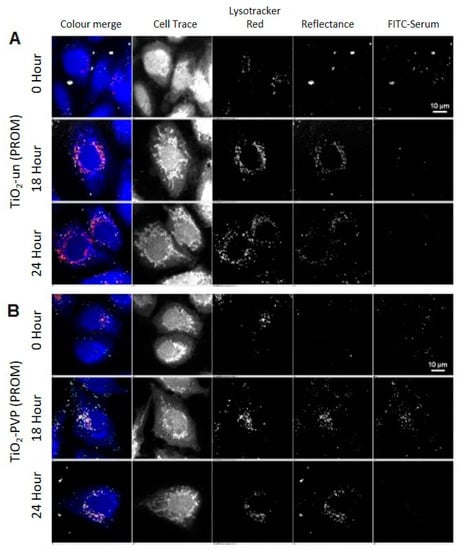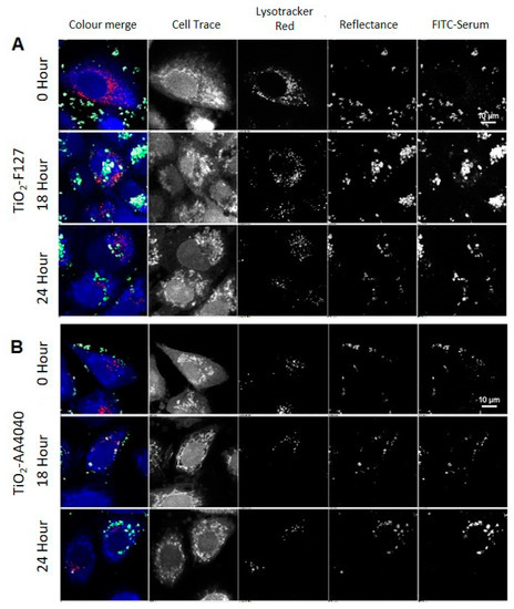 To this end, cells were stained with Cell Trace Violet prior to treatment with FITC-serum-incubated TiO2 NMs, as previously described. Fifteen minutes prior to fixation at 0, 2, 6, 18, and 24 h post-treatment cells were further stained with Lysotracker Red for co-localization studies. A fixed cell approach was used here to reduce the background fluorescence, as observed in live cell imaging, and to remove the possibility of FITC photo-bleaching through repeated acquisitions.