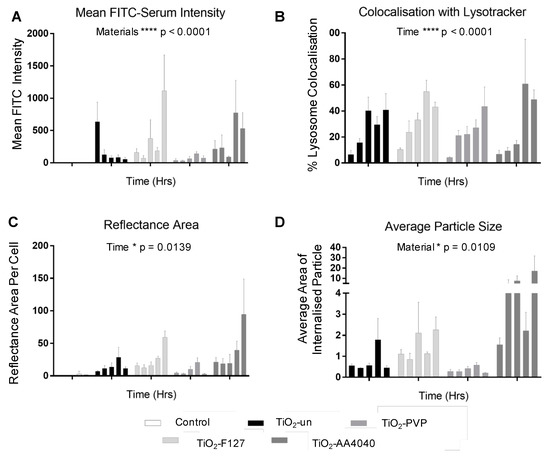 (A) Quantification of confocal data at 0, 2, 6, and 24 h post-exposure shows a change in the FITC-serum signal over time. While TiO2-un NMs rapidly lose the FITC-serum signal, surface-modified particles retain this, with a steady increase over time. TiO2-PVP demonstrates a slight reduction in signal between 18 and 24 h, potentially indicative of lysosomal degradation. (B) All four NMs demonstrate a steady increase in lysosomal co-localization, with significance demonstrated over time (**** p < 0.0001), but not between materials. (C) An increase in the reflectance area over time, indicative of NM uptake, is observed (* p = 0.0139), with no significant difference in NMs observed, consistent with the equivalent exposure of each NM type to the cells in question. (D) Finally, a difference in NM agglomerate size (in microns) is noted between materials (* p = 0.0109) consistent with images which show TiO2-PVP internalized as small discrete agglomerates, compared to the larger agglomerates of TiO2-F127 and TiO2-AA4040 observed (two-way ANOVA, SEM, n = 3).
