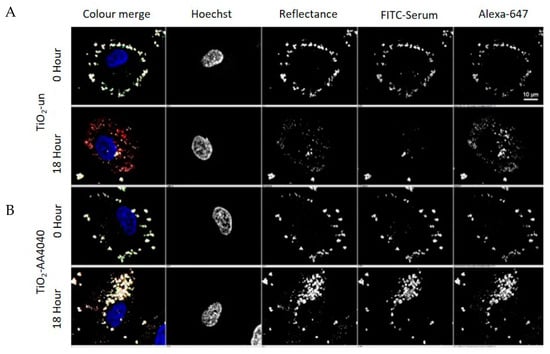 A preliminary trial of this approach demonstrated a remarkable difference between TiO2-un and TiO2-AA4040 NMs at 0 and 18 h (Figure 6). Firstly, both FITC- and Alexa-647-labeled serum adsorb onto TiO2-NMs at 0 and 18 h. Interestingly, TiO2-un demonstrates a loss of the FITC-serum signal at 18 h, as indicated previously; however, there appears to be retention of the Alexa-647 signal, which was acquired post-uptake. TiO2-AA4040 NMs once again evidence the internalization of large intracellular agglomerates which retain both the FITC and Alexa-647 signal at 18 h post-treatment.