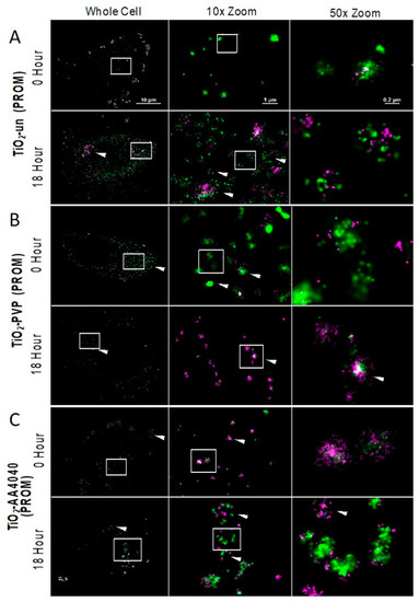 3.2. Confocal Investigation of the Uptake and Trafficking of TiO2 NMs with Different Surface Coatings