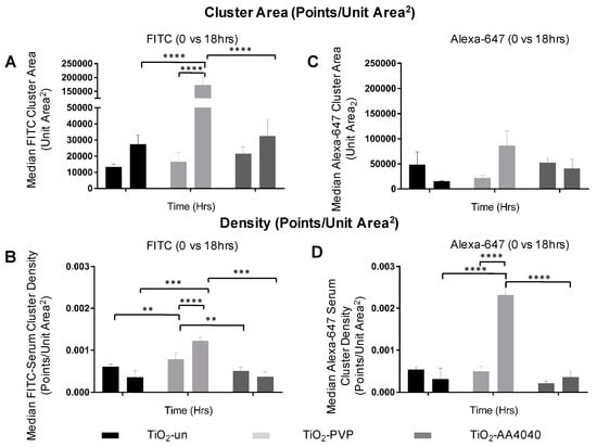 Cluster analysis of STORM data shows (A) a significant difference in the FITC-serum cluster size between TiO2-PVP and its uncoated and AA4040-coated counterparts (**** p < 0.0001). (B) Similarly, the FITC cluster density is increased at 18 h when compared to TiO2-un and TiO2-AA4040, consistent with the retention of a densely-packed FITC-serum corona. Interestingly, no significant difference in cluster area is observed in any of the observed samples (C); however, an increase in density is observed in the secondary Alexa-647-labeled protein at 18 hours in PVP-coated TiO2 (p < 0.0001) (D), suggesting the adsorption of Alexa-647-labeled protein to internalized PVP at this time point (two-way ANOVA with multiple comparisons, SEM, n = 3).