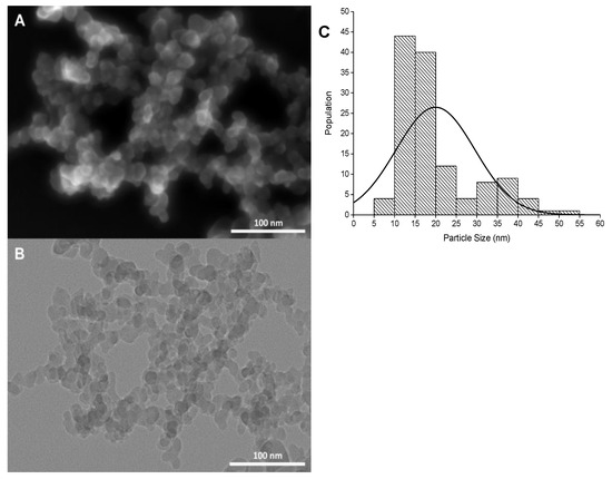 (A) Scanning and (B) Transmission Electron Micrographs (SEM and TEM) of commercial silica nanoparticles (SiO2NPs). Size distribution histogram (C) obtained from the analysis of the micrographs.