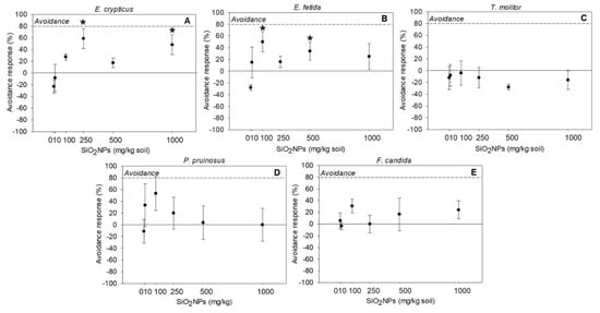 In general, there was a tendency of the organisms to avoid SiO2NPs spiked soils, with this response being significantly different from the control at the concentrations of 250 and 1000 mg/kg (p = 0.001 and p = 0.008, respectively) for E. crypticus (Figure 5A) and at 100 and 500 mg/kg (p = 0.0012 and p = 0.038, respectively) for E. fetida (Figure 5B). However, the calculated percentages of avoidance (E. crypticus: A = 58.7 and 48.3% for 100 and 500 mg/kg, respectively; E. fetida: A = 50.0 and 34.2% for 100 and 500 mg/kg, respectively) were not equal or higher than 80%, which can indicate that the habitat function will not be compromised after the exposure to the tested concentrations of SiO2NPs. Concerning the other tested species: T. molitor (Figure 5C), P. pruinosus (Figure 5D) and F. candida (Figure 5E), the selected concentrations of SiO2NPs did not have a significant effect on their behavior, comparing with the control groups (p > 0.05).