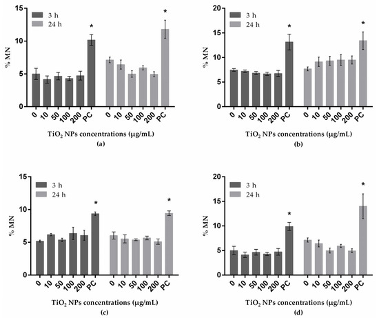 MN frequency determined by flow cytometry in A549 (human lung epithelial cell line) (a); HepG2 (human liver cell line) (b); A172 (human glial cell line) (c); and SH-SY5Y (human neuronal cell line) (d) treated with TiO2 NPs. PC: positive control. * P ≤ 0.05 significant difference regarding the corresponding negative control. Data were analyzed, using the Kruskal–Wallis test for comparison between groups, followed by Dunn´s multiple-comparisons test, to verify possible differences between treatments and respective negative control within each period; the Mann–Whitney test was used to verify possible differences between the two periods of incubation for the same treatment.