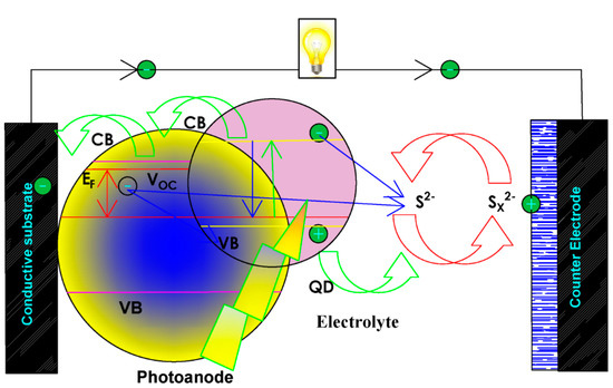 Quantum dots sensitized solar cells (QDSSCs) are emerging innovations for photovoltaic cells as a replacement for the ideal dye-sensitized solar cells (DSSCs). The maximum efficiency of 13.4% obtained from inorganic sensitizer [1] has led many scientists to the research on fabricating better photosensitizes. That can portray a good generation of multiple excitons [2,3], panchromatic characteristics [4], and photostability [5] that will deal with the shortfall of molecular dyes in the traditional DSSCs. The fabrication of quantum dots (QDs) sensitizer materials to enhance this kind of solar cells has gained ground due to their diversity [6,7], tunable band-gap, cost-friendliness, and easy fabrication. QDs size can be controlled to obtain optimum band gap, as well as incorporate other semiconductor QDs materials as co-sensitized to enhance their photospectral properties and increase the conversion efficiency of QDSSCs (as seen in Figure 1) [8,9,10]. Moreover, the challenges involving metal-oxide surface and the absorbers poor contact due to the inabilities of photoinduced charge separation to directly penetrate each other served as a major restriction [11].