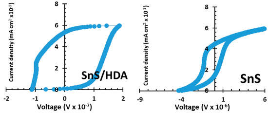 I–V characteristics of SnS/HDA and SnS nanoparticles.