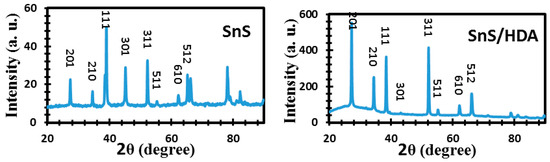The appropriate instrument to investigate structural phase unit cell dimension and lattice parameters of SnS/HDA and SnS photosensitizer films is X-ray diffraction (XRD) analysis. Figure 5 reveals the XRD configurations. Their peaks of 2θ range between 27–82° that correlated to orthorhombic SnS crystals (JCPDS 039-0354). Furthermore, both materials display no traces of other impurities as observed in the XRD patterns. The purity and quality of the crystalline are displayed by the strong and sharp diffraction peaks observed in both samples. The improvement in crystalline quality could be linked to nucleation control, which promotes the growth process of SnS [28]. In addition, there is no change in the preferential orientation along (201), (210), (111), (301), (311), (511), (610), and (512) for both samples, which confirms successful fabrication of SnS and SnS/HDA into the lattice of TiO2 [29]. The preferential orientation of SnS/HDA is linked to the nucleation control of the growth process due to excess HDA used during the synthesis [30]. The presence of lower intensities and minor phases are usually linked to defect chemistry, thermodynamics of solid, and thermal gradient.