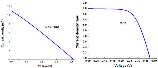 Table 1 and Figure 6 display I–V parameters of SnS/HDA and SnS photosensitizers quantum dot solar cells (QDSCs). TiO2 photoanode sensitized with the fabricated dye, and Pt counter electrode and redox couple HI-30 electrolyte was used. In order to evaluate the efficiency of the photosensitized materials, these materials were fabricated with the same test conditions. The SnS/HDA and SnS JSC is observed at 10.99 mA cm−2 and 1.802 mA cm−2, producing conversion efficiency at 1.25% and 0.42%. Their photovoltaic characteristics of QDSSCs films based for VOC are 0.423 V and 0.375 V. The lower conversion efficiency of SnS compared to SnS/HDA could be linked to the low electrocatalytic activity, which reduce HI-30 iodide and low electrical conductivity. These hinder electron transport from recombining with holes because of redox couple [31].