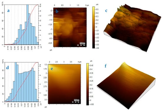 Height profile (a,d), 2D (b,e), and 3D (c) atomic force microscopy (AFM) images of SnS (a–c) and SnS/HDA (d–f) nanoparticles.