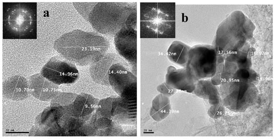 The measurements and morphology of the synthesized SnS/HDA and SnS were examined by HRTEM; Figure 9 reveals, that the products are spherical, clustered, and agglomerated, with crystallite sizes within the range 14.96–44.39 nm for SnS and 9.5–23.19 nm for SnS/HDA [34]. Their lattice fringes revealed polycrystalline nanoparticles comprising numerous crystal grains d-spacing of 3.549–3.623 nm, affirming their polycrystalline nature, which is in concurrence with the report from Reference [35]. SAED obtained reveals the spot pattern shaping of the diffraction rings, which indicates that both materials have high crystalline nature [36].