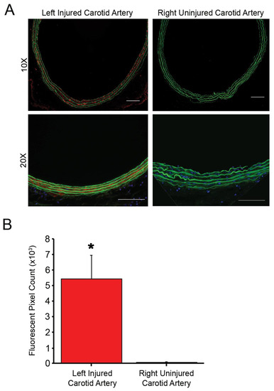 Immunofluorescent staining of fractalkine is present in left injured carotid artery with no fluorescent staining in the control uninjured right carotid artery. (A) Fluorescent microscopy of left injured and right uninjured carotid artery stained for CX3CL1. Green = autofluorescence of arterial lamina and red = CX3CL1 staining. Magnification, 20×; n = 3/treatment group; scale bar = 100 µm. (B) Quantification of fluorescence demonstrates the elevated expression of fractalkine in the injured artery compared to control uninjured artery, * p < 0.05.