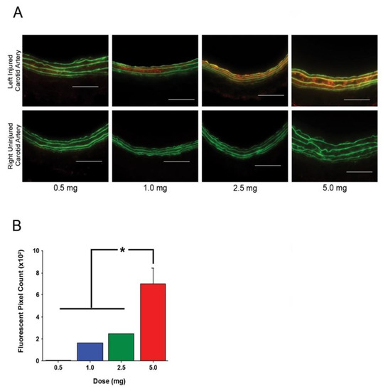 The optimal dose of targeted nanofibers for subsequent in vivo studies was determined by injecting animals with a range of doses (0.5–5 mg). While the lowest dose appeared to show signal on arterial cross-sections, no quantifiable amount was observed (Figure 4). The lowest amount of targeted nanofiber injected that allowed for quantification was observed at 1.0 mg (Figure 4A). Quantification of the fluorescent signal on the arterial cross-sections revealed a statistically significant increase in fluorescent signal with injection of 5.0 mg versus 0.5, 1.0, and 2.5 mg (Figure 4B, p < 0.05). No statistically significant difference was observed between 1.0 and 0.5 mg (p = 0.053), 2.5 and 1.0 mg (p = 0.78), and 2.5 and 0.5 mg (p = 0.37), but there was a trend toward an increase in fluorescent pixels (Figure 4B).