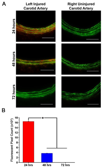 Fractalkine-targeted nanofiber remains localized to the left injured carotid artery for 24 and 48 h without localizing to the right uninjured carotid artery. (A) Fluorescent microscopy of fractalkine-targeted nanofiber in injured carotid arteries exhibits localization to the medial surface of the left injured carotid artery for up to 48 h with no remaining nanofibers at 72 h and no localization in the right uninjured carotid artery. Green = autofluorescence of arterial lamina and red = TAMRA-tagged nanofiber. Magnification, 20×; n = 3; scale bar = 100 µm. (B) Quantification of fluorescence demonstrates localization of fractalkine-targeted nanofiber to the injured artery at 24 and 48 h post injection and no remaining quantifiable fluorescence at 72 h, * p < 0.05.