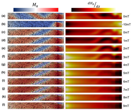 Figure 3a shows the MFM image obtained at remanence after saturation in the negative field direction. The internal structure seen throughout the wire suggests a more complex state than a simple single domain. Application of 1 mT field increments to 2 mT (Figure 3b,c) shows a reduction of contrast at the wire ends and a more intricate connected internal structure consisting of oscillations across the wire length. Further field increments up to 4 mT (Figure 3d) yields contrast at the ends opposite to that seen in Figure 3a, suggesting a switched horizontal component of the magnetization. Additionally, the intricate structure within the wire has started to fade, which continues with increments up to 10 mT (Figure 3e–k), until strong contrast is only visible at the wire tips (Figure 3k).