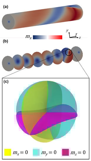 (a) Rotated and (b) cross-sectional views on the wire at 0 mT after saturation at 10 mT along long-axis (x-direction). Color scale normalized ±1. (c) Isosurfaces plotted in spherical region within the wire, as indicated by circled region in (b). Intersection of mx = my = mz = 0 isosurfaces demonstrates the existence of the Bloch point.
