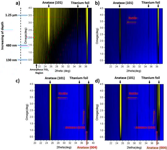 Figure 4b), no amorphous region is observed and anatase (101) peak can be seen at a penetration depth of ca. 10 nm. It can be also concluded that the crystallinity of the material increases with the depth of penetration. Moreover, the weak peak corresponding to rutile also appears at Gi-XRD 2-D image scan that is not measured by means of Raman spectroscopy. The presence of rutile phase for the amorphous TiO
