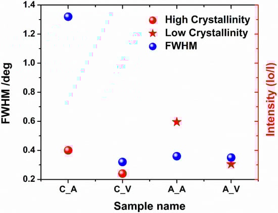 Figure 5), it can be stated that the calcined samples processed by laser exhibit higher intensity and crystallinity regarding the amorphous ones. That means that the laser beam fluence was low enough not to degrade the crystal structure of the samples. Nevertheless, it can be clearly seen that the ratio is smaller for a calcined sample treated in vacuum in comparison to the one treated in the air, which suggests that the degradation process may be initiated, and this observation is in agreement with the Raman measurements (see