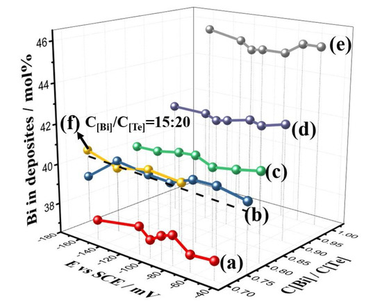 Figure 2 shows the elemental composition of the deposits for different electrolyte concentrations and deposition potentials. The concentrations of Bi:Te in electrolytes were (a):7 mM:10 mM, (b):7.5 mM:10 mM, (c):8 mM:10 mM, (d):9 mM:10 mM, (e):10 mM:10 mM, and (f):15 mM:20 mM. The composition of the TE films depended on the electrolyte, but the elemental ratios of the deposits did not equal to those of the electrolyte. Furthermore, the composition of the deposits had no dependence on the over-potential. The deposits satisfied with the nominal stoichiometric ratio of Bi2Te3 when the Bi:Te concentrations in the electrolytes were 7.5 mM:10 mM and 15 mM:20 mM; that is 3:4 for the Bi:Te in the electrolyte. The composition of the deposits was less than 2:3 when the electrolyte concentration ratio was less than 3:4, because the HTeO2+ ions were preferentially adsorbed on the Pt substrate during electrodeposition. The electrodeposition rate had a strong relationship with the adsorption capacity of the HTeO2+ ions. When the HTeO2+ concentration in the electrolyte increased, the number of ions adsorbed on the Pt electrode surface increased, which increased the reaction rate [42]. The adsorption capacity of HTeO2+ ions was not related to the over-potential. The composition of the electrodeposited films can be expressed by Equation (4):