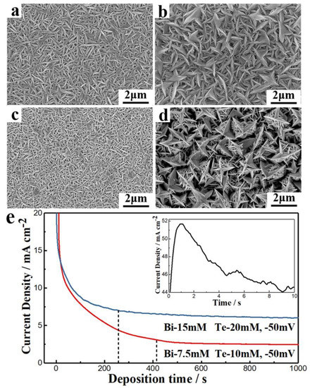 (a,c) The deposit morphologies when deposited at −50 mV and −90 mV from the electrolyte containing 7.5 mM Bi and 10 mM Te. (b,d) The morphologies when deposited at −50 mV and −90 mV from the electrolyte containing 15 mM Bi and 20 mM Te. (e) Current density vs. deposition time at −50 mV for 7.5 mM Bi and 10 mM Te, and 15 mM Bi and 20 mM Te.