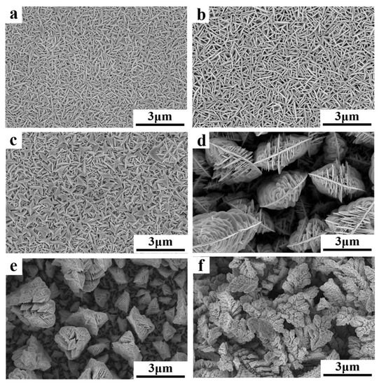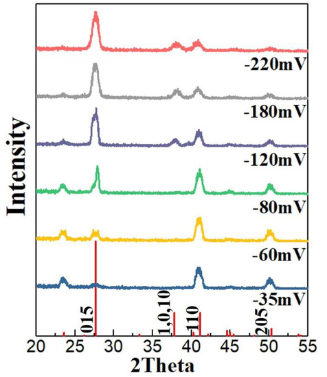 Figure 4 shows the micro-morphology of the films deposited after 1200 s in the 7.5 mM Bi and 10 mM Te electrolyte. The deposition potentials were (a) −35 mV, (b) −60 mV, (c) −80 mV, (d) −120 mV, (e) −180 mV, and (f) −220 mV. The grains were lamellar with uniform sizes for the −35 mV and −60 mV potentials. The crystal grains were less than 1 μm in size with few branches. Each lamellar grain was closely arranged and grew perpendicular to the substrate. At −80 mV, the grains became coarse, the sizes were no longer uniform, and there were some quadrangular clusters. At −120 mV, more small dendrites parallel to each other were generated on the main crystal axis at a specific angle. The volume of the crystal grains and the gaps between the grains substantially increased. At −180 mV and −220 mV, the shuttle-shaped grains composed of lamellae were staggered in more directions to form larger clusters. These grains no longer grew perpendicular to the substrate, but uniformly in all directions. Overall, with increasing over-potential, the grain morphology changed from densely lamellar with uniform growth directions to large clusters with staggered dendrites. The preferred orientation disappeared and the gaps between grains increased, thus the density decreased. The color of the films turned from gray to black as the over-potential increased, and the surface roughness increased. Finally, the binding force of the deposits to the substrate decreased and they easily fell off [48,49,50].
