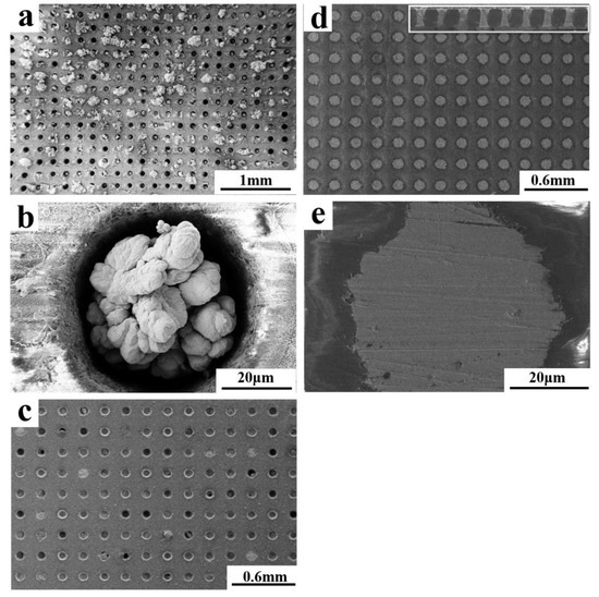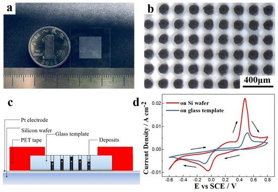 High aspect ratio and high-integration TE micro-columns were deposited on the microporous glass template. Figure 9a,b shows physical and optical micrographs of a microporous glass template, respectively. The outer size of the glass template is 2 cm × 2 cm and the thickness is 200 μm. A series of regularly arranged through holes with a diameter of 60 μm and a spacing of 200 μm were created via laser etching at the center 1 cm × 1 cm area. The non-conductive glass template was fixed on the silicon wafer via patterned polyethylene glycol terephthalate tape during electrochemical deposition (see Figure 9c) and then connected to the negative electrode of the electrochemical workstation. Figure 9d shows the CV curves of the electrolyte with a 7.5 mM Bi ion concentration and 10 mM Te ion concentration when scanning on the silicon wafer and the microporous glass template. The current densities of the deposition and dissolution peaks on the glass template were much smaller than those on the silicon wafer. The −90 mV potential corresponding to the deposition peak on the glass was more negative than that for the silicon (−35 mV). Therefore, deposition on the microporous glass template was more difficult, and a larger driving force was required.