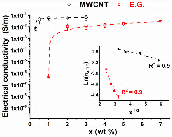 Figure 1 shows the electrical conductivity (σe) as a function of the filler concentration (wt.%) (x) for both nanocomposites based on MWCNTs and EG.