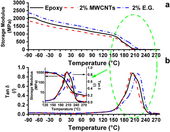 Figure 2 shows dynamic mechanical analysis for systems with and without fillers: (a) storage modulus and (b) loss factor (tan δ) vs. temperature for neat resin (i.e., epoxy) and nanocomposites filled with 2.0 wt.% of MWCNTs and expanded graphite, respectively.
