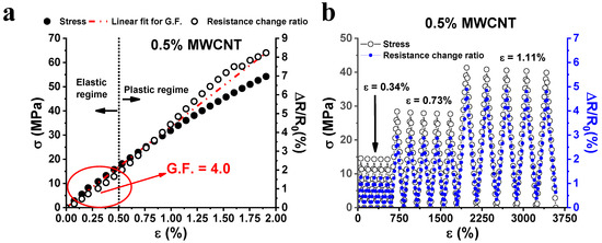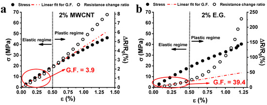 The strain value of 0.5% discriminates the elastic/plastic regime of the material in which the mechanical response against the tensile stress is linear and nonlinear, respectively. In other terms, below this critical value, the material preserves its structural integrity whereas, beyond this value, it exhibits non-recoverable deformation (plastic regime) due to the irreversible modifications in the arrangement of the molecular segments in the resin network. Such a mechanism agrees with that concerning the resistance change ratio (right vertical axis, Figure 3a) caused by the applied axial tension. In fact, also with reference to this electrical property, in the first region corresponding to the elastic regime of the material, the value of ΔR/R0 shows an initial linear dependence with the applied strain. Then, when the strain threshold value of 0.5% is exceeded, a sharp change in the slope of the resistance change ratio is found. The irremediable deformations in the material due to mechanical stress cause the enlargement of the inter-tube distance and/or a decrease in the electrical contact areas. As discussed in [36], and analyzed in detail further on, this leads to an increase in the tunneling resistance between neighboring carbon nanotubes. From the slope of the line interpolating the experimental data of ΔR/R0 vs. strain, it is possible to compute the value of the gauge factor that is the usual parameter used to quantify the sensitivity of sensing materials. Figure 3b shows the results of cyclic tensile loading-unloading tests. A strain whose maximum value increases (i.e., 0.34%, 0.73%, and 1.11%) is applied and, synchronically, the resistance is detected. More in particular, when the strain falls in the elastic regime (i.e., ε = 0.34%), ΔR/R0 is null after each loading cycle because no significant permanent deformation has occurred in the sample. Instead, when strain falls in the plastic regime, (i.e., ε = 0.73% and ε = 1.11%) the presence of residual resistance is observed, after each loading cycle. For ε = 0.73%, the residual resistance found is small (i.e., ΔR/R0 ≈ 0.05%), because the strain value is still very close to the elastic/plastic regime threshold (ε = 0.5%). For a value of ε = 1.11%, the residual resistance found is higher (i.e., ΔR/R0 ≈ 0.3%), as the strain value lies in full plastic regime. Therefore, the microscale damages appear directly related to the resistance changes. Hence, they can be easily detected in a non-destructive way by detecting the residual resistance. This parameter increases with the increasing amount of plastic strain accumulated in the matrix. This behavior is due to the partial disconnections of the electrical network of MWCNTs embedded in the epoxy resin. As indicated before, if the plastic deformation induces an increase in the distance between neighbor CNTs aggregates larger around 2 nm or more, the tunneling effect becomes ineffective and thus the overall resistance increases. This effect is interesting because the sensor allows the detection of otherwise not viewable damages in the structure of the material [4,9]. Figure 4 shows the comparison of the piezoresistive properties of nanocomposites filled with 2 wt.% of MWCNTs and EG (see Figure 4a,b respectively).