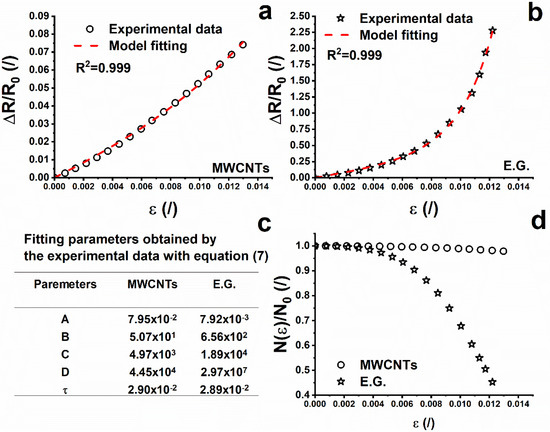 (a) Experimental data and theoretical predictions of resistance change ratio (ΔR/R0) as a function of strain for MWCNTs composite at 2% by weight and (b) EG composite at 2% by weight; (c) N(ε)/N0 as a function of strain of the systems at 2% by weight and (d) fitting parameters relating the Equation (7) of the systems at 2% by weight.