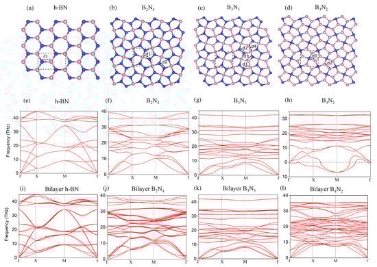 (a–d) unitcell of atomic configuration of monolayer pentagonal BN; (e–h) phonon spectra of monolayer pentagonal BN; (i–l) phonon spectrum for bilayer pentagonal BN.
