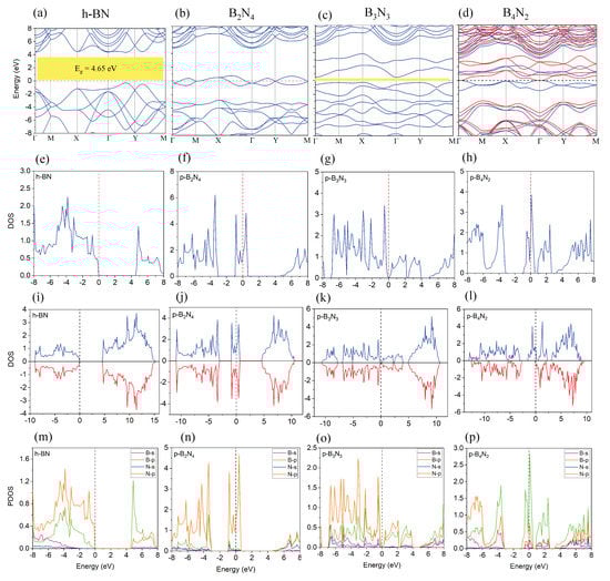 (a–d) electronic band structure of the h-BN and monolayer pentagonal BN; (e–h) total electronic density of states (DOS) and (i–l) total spin polarized DOS of the h-BN and monolayer pentagonal BN; (m–p) projected density of states (PDOS) for bilayer pentagonal BN.