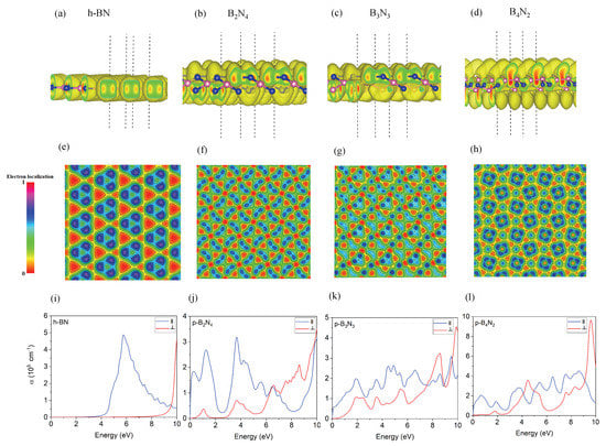 (a–d) the electron localization function (ELF) with hybridization orbitals of the monolayer h-BN and monolayer pentagonal BN; (e–h) the ELF of the monolayer pentagonal BN compared with h-BN. The reference bar for ELF brought at the right with isovalue 0.15 e/A for charge density; (i–l) optical absorption spectrum of monolayer h-BN and monolayer pentagonal BN.