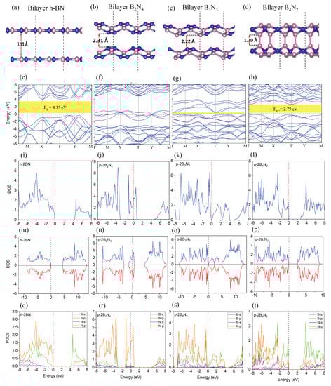 (a–d) unitcell of atomic configuration of bilayer pentagonal BN, (e–h) electronic band structure of the h-BN and monolayer pentagonal BN; (i–l) total electronic density of states (DOS) and (m–p) total spin polarized DOS of the h-BN and monolayer pentagonal BN; (q–t) projected density of states (PDOS) for bilayer pentagonal BN.