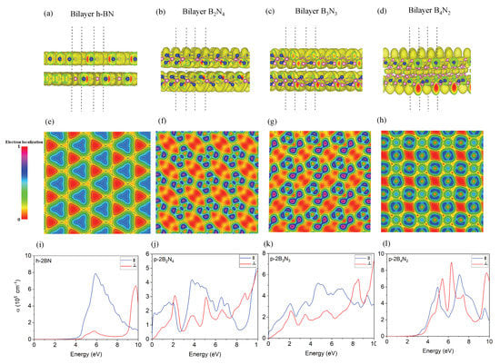 (a–d) the electron localization function (ELF) with hybridization orbitals of the bilayer h-BN and bilayer pentagonal BN; (e–h) the ELF of the bilayer pentagonal BN compared with bilayer h-BN. The reference bar for ELF brought at the right with isovalue 0.15 e/A for charge density; (i–l) optical absorption spectrum of bilayer h-BN and bilayer pentagonal BN.