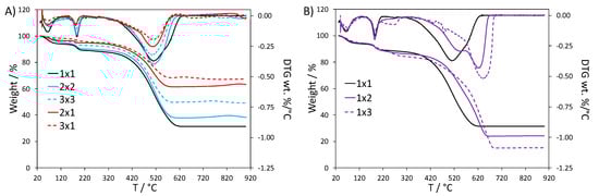 Differences in the thermal stability of the composites can be better appreciated by comparing the weight loss derivative (DTG) curves (Figure 1). The composites with higher TiO2 content showed the same DTG profile as the reference 1 × 1 sample (Figure 1A), where water desorption, HCl loss and polymer degradation give rise to peaks at 70, 187 and 510 °C, respectively [,,,]. Similar results are observed when both the TiO2 and H2O2 amounts are increased. On the other hand, when only the H2O2 amount is increased, a second peak component with higher thermal stability is appreciable for the polymer chain degradation (1 × 2 and 1 × 3 in Figure 1B): this second component becomes more important and progressively shifted to higher temperature by increasing the H2O2 quantity (625 and 640 °C for 1 × 2 and 1 × 3, respectively). Moreover, the DTG curve of the 1 × 3 sample presents also a peak at 267 °C, which could be attributed to HCl bound in a stronger way to the polymer backbone or to oligomer chains degradation. It is noteworthy that the DTG curve of PANI_ref (Figure S1) displays broader peaks with respect to the 1 × 1 curve, both in the case of dopant loss and of the polyaniline chain degradation. In particular, DTG peak components at higher temperatures are appreciable, similarly to the case of the 1 × 2 and 1 × 3 curves.
