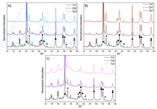 Normalized XRPD diffractograms (with respect to the anatase TiO2 (213) peak): (A) effect of changing both the TiO2 and H2O2 amounts; (B) effect of changing only the TiO2 amount; (C) effect of changing only the H2O2 amount. The stars and triangles highlight the peaks related to the TiO2 crystalline phases (anatase and rutile, respectively []).