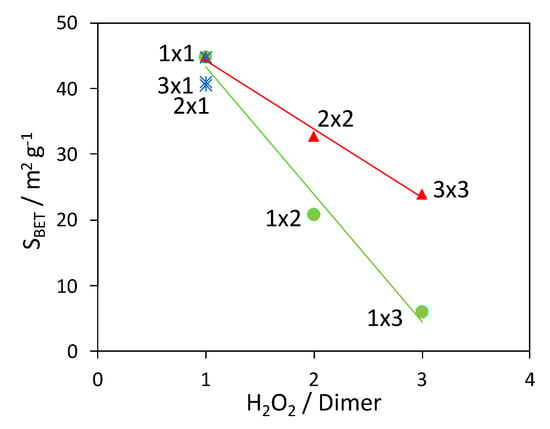 The variation of the composite surface area with the H2O2/aniline dimer molar ratio is reported in Figure 3. As observed in the case of XRPD analyses, the variation in the photocatalyst amount does not significantly affect the properties of the composites: in fact, samples 1 × 1, 2 × 1 and 3 × 1 have comparable surface areas (blue stars in Figure 3). On the contrary, when the H2O2 quantity is increased, the specific surface area shows a clear decreasing trend. While the surface area lowering is less marked for the 2 × 2 and 3 × 3 composites (red triangles in Figure 3), the BET area drastically drops to few square meters (similarly to PANI_ref, 3 m2 g−1) when only the H2O2 amount is increased (green dots in Figure 3).