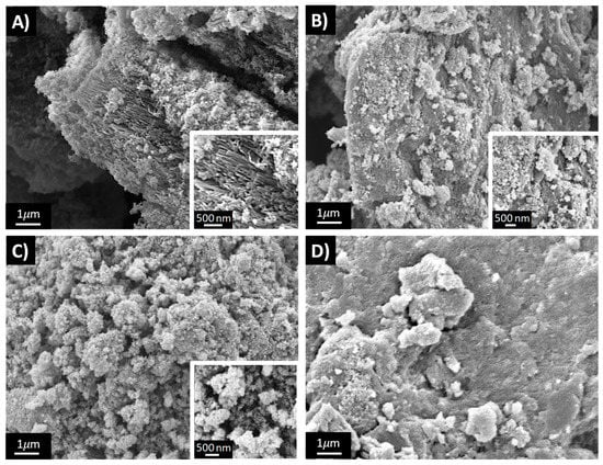 In agreement with BET results, the morphology of the materials is mainly influenced by the H2O2 amount used for their synthesis. In fact, 1 × 1 (Figure 4A) and 3 × 1 (Figure 4C) samples exhibit a similar sponge-like nanostructured morphology characterized by nanorod morphological structures, as clearly shown in Figure 4A inset. On the contrary, the 1 × 3 sample (Figure 4D) is characterized by larger and smooth aggregates, whereas the 3 × 3 sample displays intermediate morphological characteristics (Figure 4B). It should be noted that the reference sample (PANI_ref) presents an even more compact morphology characterized by micrometric and smooth particles [].