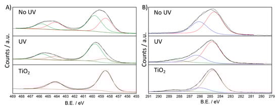High resolution XPS spectra, and relative fitting, of NoUV, UV and TiO2 samples: (A) Ti 2p region and (B) C 1s region.